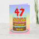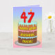 This fun and colourful birthday greeting card design features a cartoon-style depiction of a three-tier birthday cake having numeral-shaped candles on top showing the number “47“, along with the message “HAPPY 47TH BIRTHDAY,”, and a custom recipient name. The background of the front features a multi-colour pastel rainbow spectrum inspired gradient pattern. The inside features a customizable birthday greeting message, or could perhaps be cleared and left blank if a message is to be written by hand instead. A joyful, editable birthday greeting card like this might be used to celebrate somebody’s forty-seventh birthday. [~Z0000625]