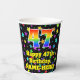 This cheerful and joyful birthday paper cup design features a large number “47” with a rainbow spectrum gradient inspired pattern, along with the message “Happy 47th Birthday,”, and a customizable name. The background features a vibrant and colourful star field inspired pattern. Vibrant, colourful paper cups like this might be fun to use at a birthday celebration being held to honour somebody’s forty seventh birthday. [~Z0000540]