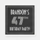This elegant forty-seventh birthday party paper napkin design features an editable name, a fancy art deco style inspired number “47th”, the message “BIRTHDAY PARTY!”, and a multi-line border. It has a black-colored background by default, but it can be customized to a different color, if desired. Stylish paper napkins like these might be used when hosting a party for somebody in celebration of their forty seventh birthday. [~Z0000616]