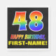This cheerful, fun, and colourful birthday themed paper napkin design features a large number "48" and the message "HAPPY BIRTHDAY,", both coloured with a rainbow spectrum gradient inspired pattern, along with a bold yellow editable recipient name. The background is coloured black. Fun, editable paper napkins like this might be used at a party being held to celebrate somebody’s forty eighth birthday. [~Z0000476]