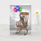 Playful tabby cat standing on a wooden rocking chair and reaching for a colourful balloon bouquet for 48th birthday.