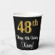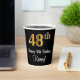 This sophisticated, stylish, and elegant birthday paper cup design features a large ordinal number “48th” having a faux/imitation gold-inspired appearance, along with the birthday greeting message “Happy 48th Birthday,” and a customizable name in a script-style font. It also has a black-coloured background. Stylish paper cups like this might be fun to use at a birthday party in honour of somebody’s 48th birthday. [~Z0000538]