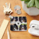 Personalizable pet photo template design for four different photos. The middle has a paw print silhouette together with two personalizable text areas. On the back there is a white paw print pattern on a black background colour. You can change the background colour and the paw print colour to any other colour, if you wish.
