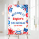 Bienvenue à vos invités avec notre 4 juillet Patriotique 3ème anniversaire Affiche de bienvenue de fête! Cette enseigne festive présente un thème rouge, blanc et bleu éclatant, parfait pour célébrer la journée spéciale de votre petit. Avec des graphismes amusants et colorés, il donne le ton pour une fête d'anniversaire joyeuse et patriotique. Faites de votre enfant le 3ème anniversaire inoubliable avec ce signe de bienvenue charmant et attrayant !