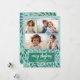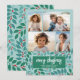 The front includes 4 photos in a modern collage with a trendy script font. The back includes a modern botanical pattern in teals and greens. The background white colour can be changed in the advanced design area.