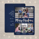 Send stylish joyful greetings and share your favourite pictures with a custom four photo collage navy blue and rose gold foil holiday card. All text on this template is simple to customize to include any wording, such as Merry Christmas, Happy Holidays, Seasons Greetings, New Year Cheers etc. (IMAGE PLACEMENT TIP: An easy way to centre a photo exactly how you want is to crop it before uploading to the Zazzle website.) Front side of card is printed with real metallic rose gold foil lettering on a navy blue ombre background. The modern minimalist design also features trendy handwritten style script calligraphy, simple typography message on back, and a unique photo grid of 4 images with captions. Family and friends will love displaying this elegant customized card.