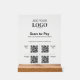 Enhance your payment experience with this elegant scan to pay transparent sign mounted on a wood base. Featuring four QR codes, this sign provides convenient options for various payment methods of your choice such as Apple, Google, Venmo, PayPal, and more.