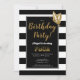A modern black and white 4th birthday party invitation with white and gold text and a gold butterfly embellishment, while featuring a gold glitter number four.