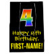 This exciting, fun, and colourful birthday-themed giftbag design features a large number "4" with a rainbow spectrum gradient style pattern, along with the message "Happy 4th Birthday,", and a custom recipient name. The background is coloured black. A giftbag like this might be used when wrapping gifts being given to somebody in celebration of their fourth birthday. [~Z0000512]