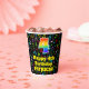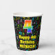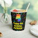 This fun and colourful music themed birthday paper cup design features a large number “4” having a rainbow spectrum gradient inspired pattern. It also features the message “Happy 4th Birthday,”, and a personalized name. The background features an exciting and colourful pattern of various music notes and symbols of different colours and sizes. Vibrant, colourful paper cups like this might be fun to have at a birthday celebration/party being held to celebrate somebody’s fourth birthday. [~Z0000541]