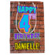 The front of this fun birthday themed gift bag design features the message “HAPPY 4TH BIRTHDAY,” having a vibrant, colourful, graffiti-inspired appearance, along with an editable recipient name. The background features a brick wall inspired pattern. A giftbag like this might be used when wrapping gifts being given to somebody in celebration of their fourth birthday. [~Z0000536]