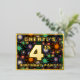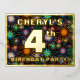 The front of this bold and eye-catching fourth birthday celebration/party foil invitation postcard design features a customizable name, a large number “4th”, the message “BIRTHDAY PARTY!”, and a border. The background of the front has a joyful, colourful pattern that resembles bursting celebratory fireworks. The back features personalized details about the event, such as the date, time, venue/location, and any other useful information. Customized invitations like these might be a fun way to invite guests to a birthday party being held to honour somebody’s 4th birthday. [~Z0000609]