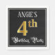 This opulent and luxurious birthday-themed paper napkin design features an editable name and the message “4th Birthday Party”. The large number “4th” has an imitation/faux gold-inspired colouring pattern, and the words “Birthday Party” are in fancy script-style text. The background is coloured black by default (although it can be customized). Ornate, fancy paper napkins like this might be useful at a birthday party/celebration being held to honour somebody’s fourth birthday. [~Z0000565]