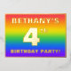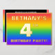 The front of this exciting fourth birthday party/celebration foil invitation card design features a custom name, a large number “4th”, the message “BIRTHDAY PARTY!”, and a border. The background of the front features an upbeat, multicolored, rainbow spectrum inspired gradient pattern. The back features personalized details about the event, such as the date, time, location/venue, and any other information that may be useful. Customized invitations like these might be a fun way to invite guests to a birthday party/gathering being held to honour somebody’s 4th birthday. [~Z0000599]