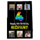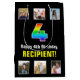 This joyful and cheerful birthday gift bag design features a large number “4“ having a vibrant multicolored rainbow spectrum inspired gradient pattern, plus the message “Happy 4th Birthday,“ and a personalized recipient name. The photos above and below the message can be personalized, perhaps with photos of the recipient, the recipient’s family and friends, and/or the sender(s) of the gift. A fun gift bag like this might be used when wrapping presents being given to somebody in celebration of their fourth birthday. (Photography © Storytree Studios, Stanford, CA.) [~Z0000669]