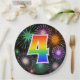 This colourful, cheerful, and fun paper plate design features a large number "4" containing a rainbow spectrum gradient inspired pattern. It also features a vibrant and exciting bursting celebratory fireworks inspired pattern. The background is coloured black. Fun paper plates like this might be used at a celebration being held to honour somebody’s 4th birthday, a 4th anniversary, or some other 4th event. [~Z0000490]