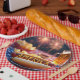 A festive setting features a hot dog on a patriotic plate, with the word "AMERICA" spelled out in mustard