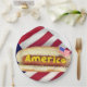 Patriotic invitation with hot dog on flag plate for 4th of July Party.