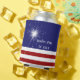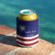 This fun can cooler is decorated with a sparkler and red and white stripes on a patriotic blue background. It is further enhanced with the saying Happy 4th of July and the family name, which is easy to customize or delete if preferred.