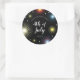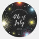 Accessorize your Independence Day party with this black night sky sticker. Script text says “4th of July”, surrounded by white stars, colourful fireworks and places to personalize with your family name and date/year.