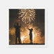 Silhouetted against a vibrant display of fireworks, a man and a child hold American flags aloft in a celebratory scene for 4th of July celebration.