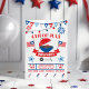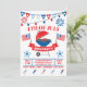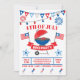 4th Of July Barbeque BBQ Party Independence Day Invitation. This design features a barbeque grill with fireworks, american flags, and string lights. Personalize this custom design with your own fourth of july party details. Light blue striped back.