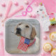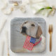 Labrador Retriever dog with an American flag in his mouth for 4th of July party.