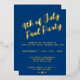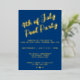 An elegant 4th of July pool party invitation. Featuring a real raised foil texture for a luxury feel on a dark blue background. With a standout script calligraphy heading. Also features a stars embellishment.
