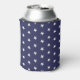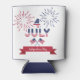 Modern red, white, and navy blue 4th of July patriotic stylish barbecue personalized can cooler with stars, stripes, fireworks, flags, and American flag style lettering.