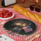 Sparklers in a glass jar illuminate the scene alongside a small American flag, set against a red and white chequered tablecloth