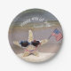 Starfish wearing flag sunglasses and bikini holding an American flag in beach sand.