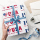 I love USA custom text Blue and Red Wrapping Paper. The text says "to the moon and back" as an example but the text is totally customizable change it and add your own text.