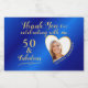 Create stylish personalized royal blue and gold Thank You mini sparkling wine labels with custom photo for the 50 and Fabulous birthday party. The template design features a heart shape photo in a golden yellow frame, first and last name of the birthday lady, and the fiftieth milestone. You can change the milestone to the 30th, 40th, 60th, or other years using the template.