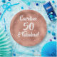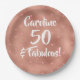 Paper party plates that celebrate milestone birthdays with a flair. "50 (name/age/year can be customized) and fabulous" in modern brush stroke white text on copper and hearts background.