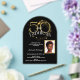 This stylish acrylic party invitation for a milestone 50th birthday reads, "50 and Fabulous". The unique arch shaped invitation can be personalized with one photograph of the birthday girl and the party details are in modern white calligraphy. The velvety black background accentuates the glitter and the gold and white lettering. Choose from an arch shape or a rectangle.