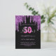A girly and feminine 50 & Fabulous birthday party invitation. On front: A chic black background. Decorated with dark purple faux glitter drips, paint dripping look. Personalize and add a name and party details. The name is written with a hand lettered style script, light purple coloured letters. Age: 50 with a trendy balloon style font.