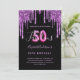 Une invitation à la fête d'anniversaire féminine et féminine 50 & Fabulous. Devant : Un arrière - plan noir chic. Décoré avec des gouttes de faux parties scintillant violet foncé, l'aspect de la peinture goutte à goutte. Personnalisez et ajoutez un nom et des détails du parti. Le nom est écrit avec un script de style écrit à la main, des lettres de couleur violet clair. Âge : 50 avec une police de style montgolfière tendance.