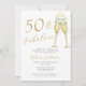 Modern faux gold trendy calligraphy script feminine 50 and fabulous years white birthday party invitation with champagne flutes.