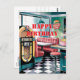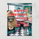A nostalgic watercolor illustration of a 1950s diner with a jukebox. There is a red vinyl booth, a counter with stools, and a window. A birthday cake with candles is placed on the counter. The diner has a chequered floor and a green wall with a sign that says "Burger Time". Customize card with your specific details.