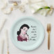 Set of eight 9” mint paper plates with an image of a brunette 50s woman with her finger on her chin as if poised to express a thought. Customizable text. See matching flask, mug, shot glass and coasters. See the entire Nifty 50s Plate collection in the FOOD/BEV | Dishes section.