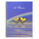 Notebook with my digital artwork of two golden hearts floating on the water under a rainbow. Customizable text says "50 Years".