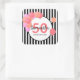 A sticker for a 50th birthday party. Classic slim black and white vertical stripes as background. With girly and feminine pink, coral, peach and golden coloured balloon arch as decoration.