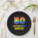 This cheerful, fun, and colourful birthday paper plate design features a large number "50" and the message "HAPPY BIRTHDAY,", both coloured with a rainbow spectrum gradient inspired pattern, along with a bold yellow customizable name. It has a black coloured background. Fun, editable paper plates like this might be used at a celebration being held to honour somebody’s fiftieth birthday. [~Z0000488]