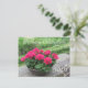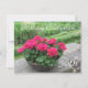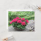 A beautiful planter of red geraniums on a rock wall with beautiful green scenery behind it. Customize as desired.