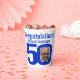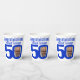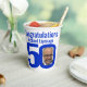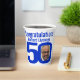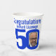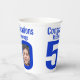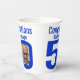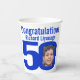 Personalize these bright blue text on white 50th birthday party paper cups with your own birthday name and two photograph in the 0 of 50. Fun text and personalized photo design. Ideal for using at a fiftieth birthday party to show a photo of your birthday boy or girl photos one now and one from their past. Other matching items are available. © Original graphic art and design by www.mylittleeden.com