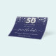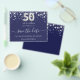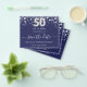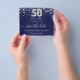 A girly and trendy Save the Date card for a 50th birthday party. A navy blue coloured background. Decorated with faux silver stars. The text: Save the Date is written with a large trendy hand lettered style script. Number 50 is written with a balloon style font.
