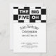 Invite your friends and family to a fun 50th birthday party with cool, modern, customizable invitations. The fiftieth milestone birthday celebration invite features a bold black and white chequered pattern at the top with the words "The Big Five Oh" in alternating white on black and black on white text. The bottom 2/3 of the flat card shows the words "50th Birthday Celebration" in black text on a white background. Customize the name, date, and party details in the sidebar. The back features a classic black and white chequered pattern.