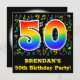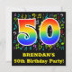 The front of this fun, colourful, and exciting birthday party invitation design features a large number "50" with a rainbow spectrum gradient inspired pattern, along with a customizable name and the message "50th Birthday Party!". Part of the background features a fun pattern of various music notes and symbols having a variety of colours and sizes. The back features personalized details/information pertaining to the event that the potential guests are being invited to. Joyful, customizable birthday celebration invitation cards like this might be used when inviting guests to attend a gathering being held to celebrate a song composer’s, a musician’s, a singer’s, or somebody else’s fiftieth birthday. [~Z0000427]
