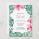This birthday party invitation features vibrant fuchsia pink tropical hibiscus flowers with monstera palm leaves. Use the template fields to add your personalized details. A charming choice for a fiftieth birthday with a tropical Hawaiian luau theme.