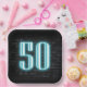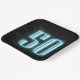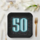 Glowing aqua neon sign on dark brick background for a 50th birthday party.